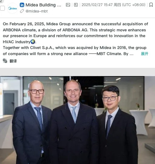 今年2月,美的宣布与在瑞士证券交易所上市的欧洲知名建筑设备供应商ARBONIA AG(ARBN.SW)签署相关交割文件,成功完成对其旗下气候部门ARBONIA climate的收购交割。在完成收购的同时,也做出了相应的环保及可持续承诺,旨在欧洲市场构建其专业、环保和负责人的企业形象。